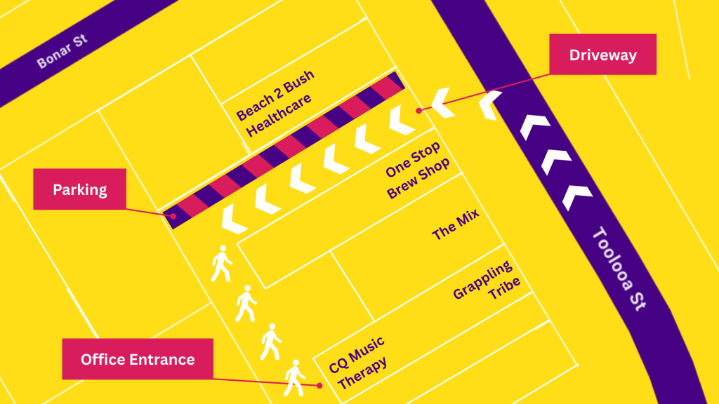 Our practice has moved! We are no longer located in the Palms Shopping Centre in Gladstone Valley – you can now find us on Toolooa Street, near Jham Bar Espresso. The CQMT office is located behind the Grappling Tribe BJJ Studio, with shared facilities, but a separate entrance at the back of the building. Please see the maps below for directions to the office, off-street parking, and how to find the entrance.